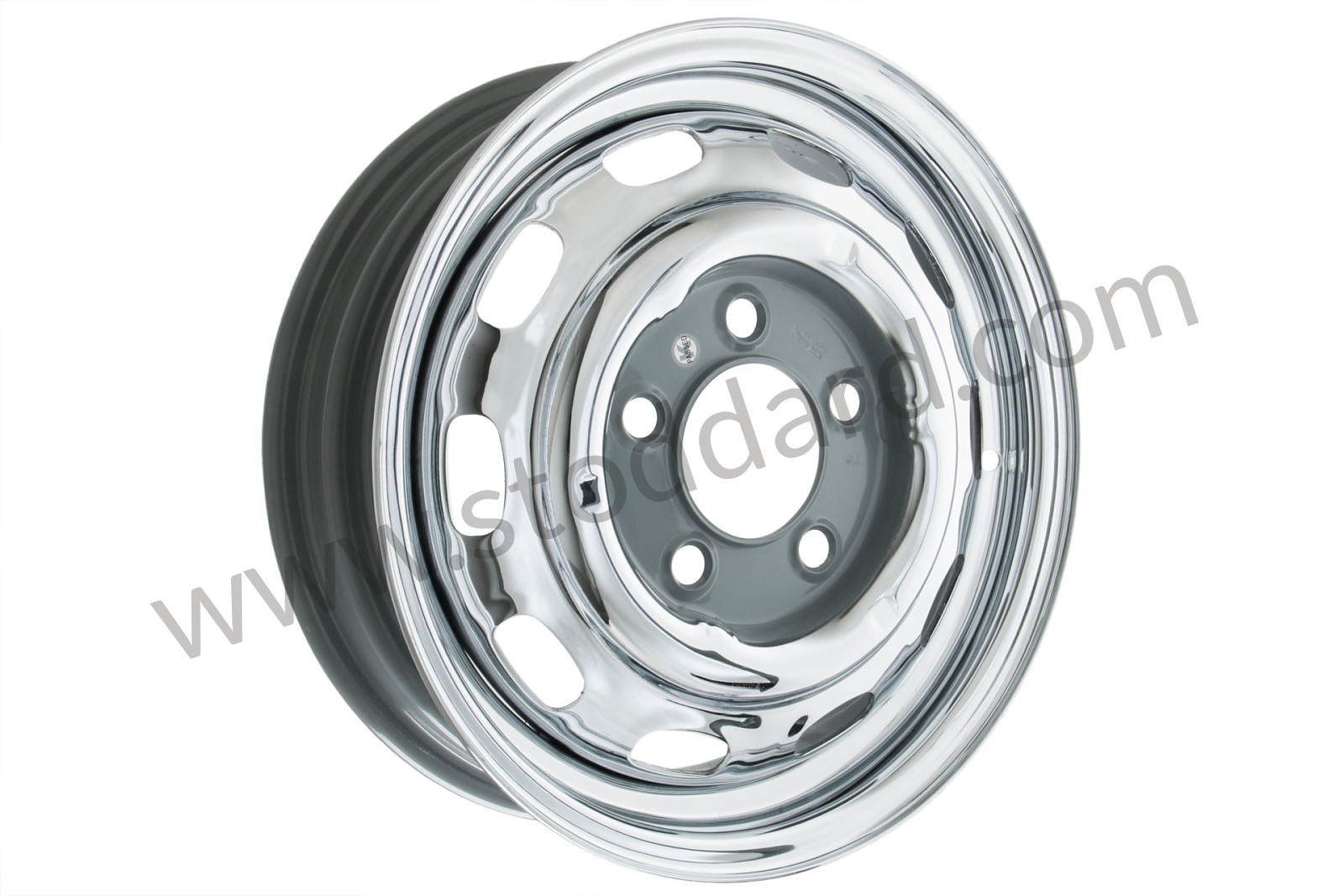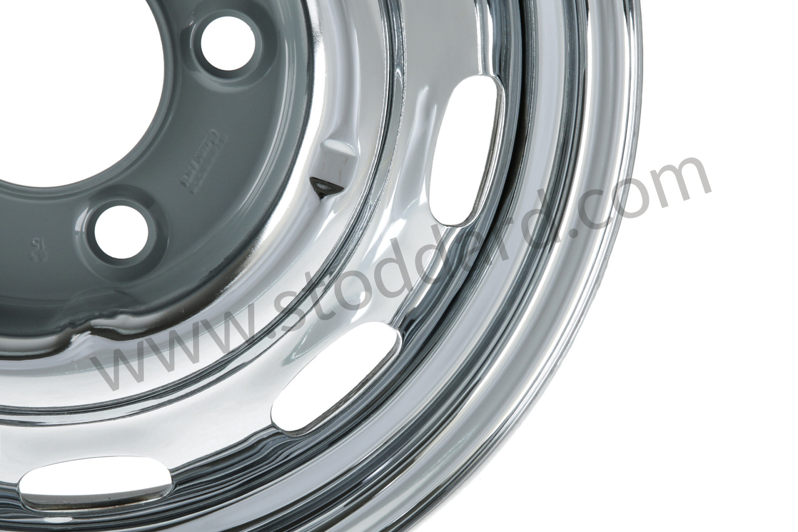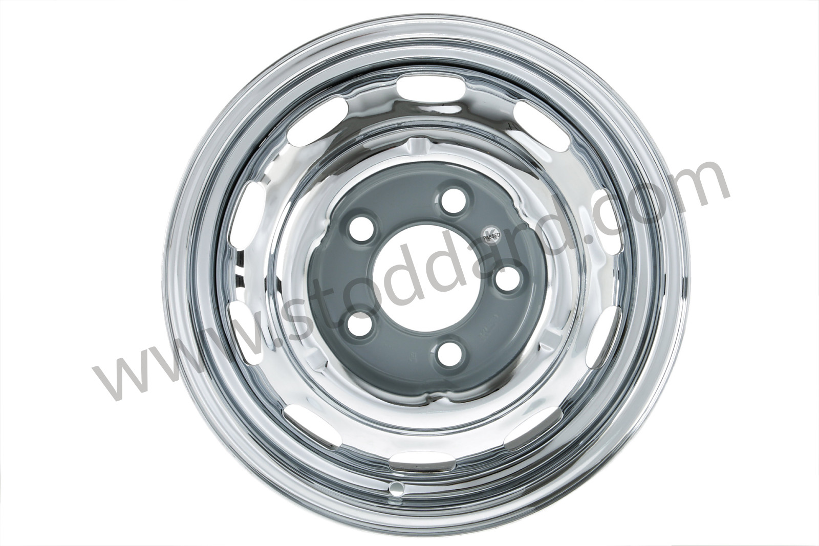 15x4.5J disc brake wheel, pressed from original German tooling, but made in U.S.A. from all our new components, triple chrome plated. Stoddard is proud to announce that the original classic steel wheels—pressed from the original German tooling—are back. These new wheels are made in the United States with modern high-strength steel and they are DOT tested and approved.
