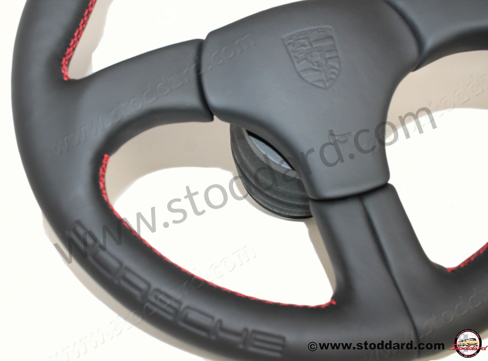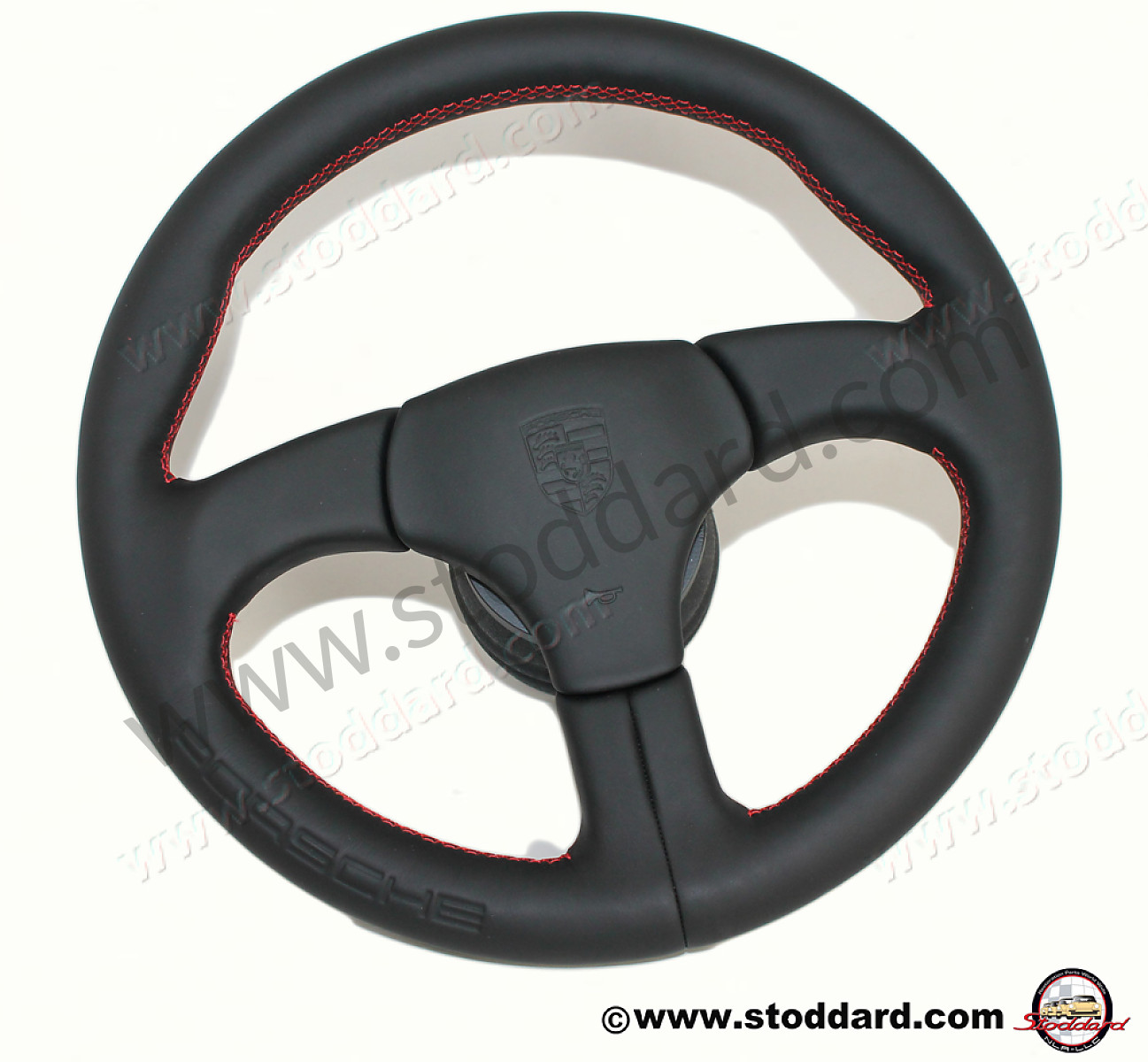 Factory Sports Steering Wheel with Red Stitching and Embossed Porsche Logo. Fits 911 1974-1989